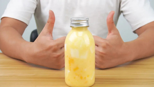 等待20-40分鍾,椰奶凍成型,將芒果肉、芒果椰奶與(yǔ)椰奶凍、一同倒入(rù)瓶子(zǐ)中,就大(dà)功告成嘍!
