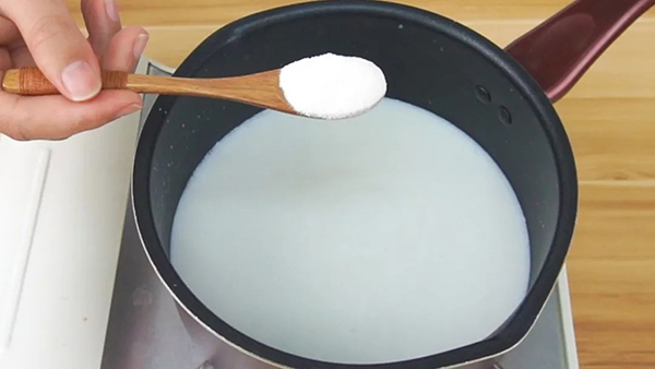 將另一份椰子粉衝泡好,倒入鍋中小火煮沸,待椰奶在鍋中沸騰後,再倒(dǎo)入適量(liàng)的白涼粉,攪(jiǎo)拌均勻,PS:這個步驟需要不斷攪拌,避免粘鍋。