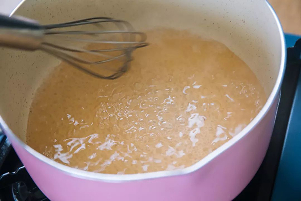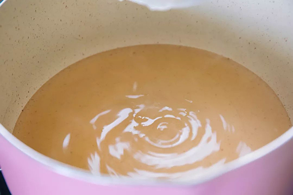 9、趁熱將30g白涼(liáng)粉液加入到椰汁湯中攪勻。