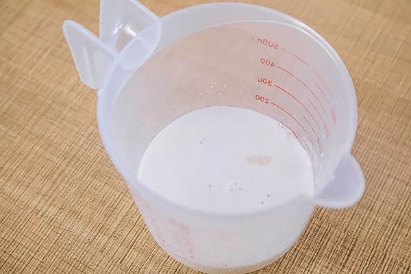 7、製作(zuò)椰子凍:將20g放涼的椰汁湯倒入10g白涼粉中攪拌(bàn)均勻。