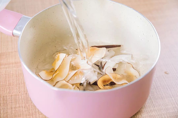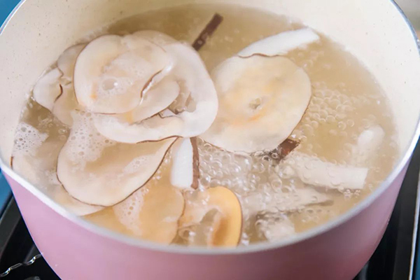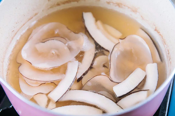 3、在鍋中加入切成片的椰肉和海(hǎi)底椰片(piàn)、2000g清水。